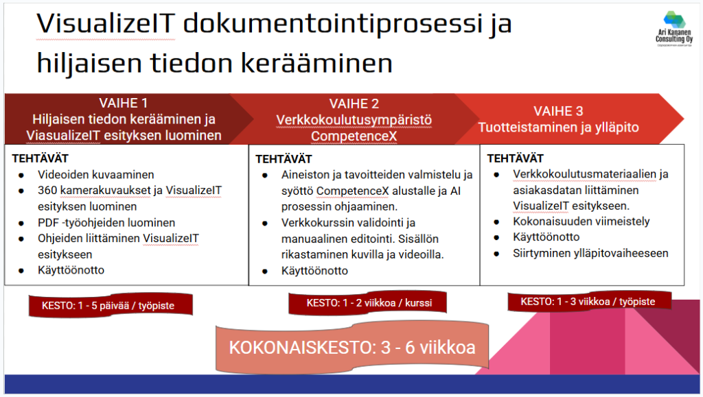 Monessa yrityksessä kriittinen osaaminen on edelleen vain kokeneimpien työntekijöiden pään sisällä. VisualizeIT tarjoaa modernin tavan muuttaa tämä ”hiljainen tieto” yrityksen pysyväksi pääomaksi – ja tekee sen ennätysajassa.