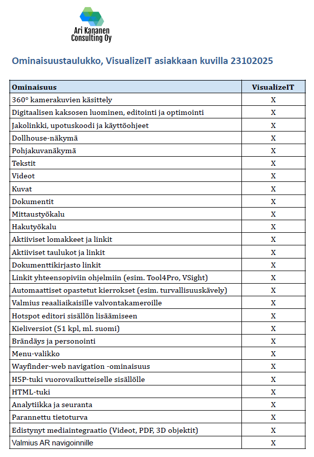 - Monialustainen integraatio: Ratkaisu ei ole sidottu yhteen työkaluun. Se yhdistää saumattomasti mm. Matterportin digitaaliset kaksoset, 360-kuvat, VSight Remoten ja VSight Workflown, Tool4Pron sekä asiakkaan omat dokumentaatiojärjestelmät. Näin kaikki tarvittava on aina saatavilla yhdestä ja samasta paikasta.